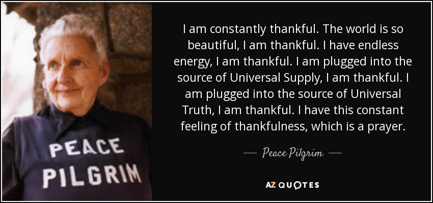I am constantly thankful. The world is so beautiful, I am thankful. I have endless energy, I am thankful. I am plugged into the source of Universal Supply, I am thankful. I am plugged into the source of Universal Truth, I am thankful. I have this constant feeling of thankfulness, which is a prayer.