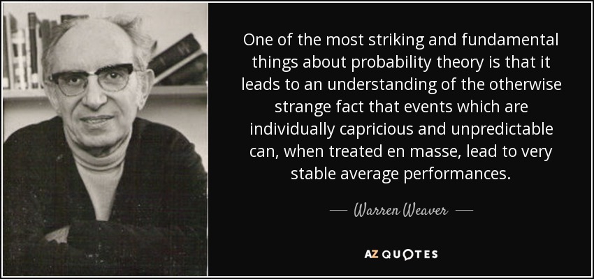 One of the most striking and fundamental things about probability theory is that it leads to an understanding of the otherwise strange fact that events which are individually capricious and unpredictable can, when treated en masse, lead to very stable average performances.