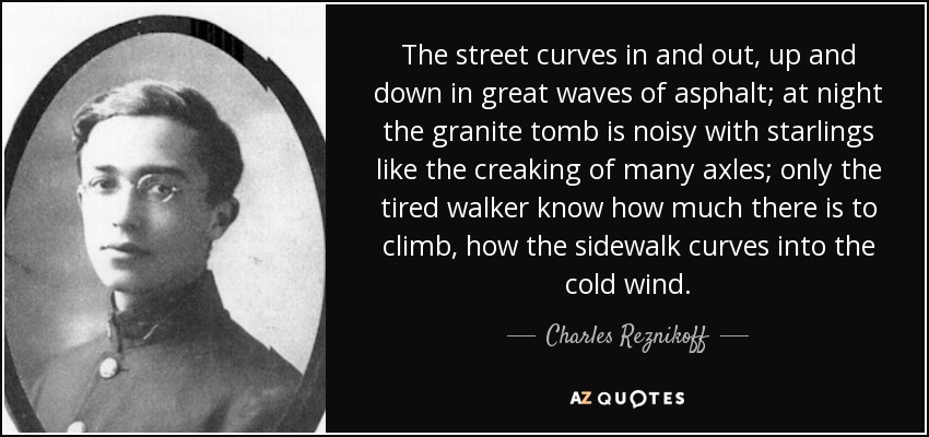 The street curves in and out, up and down in great waves of asphalt; at night the granite tomb is noisy with starlings like the creaking of many axles; only the tired walker know how much there is to climb, how the sidewalk curves into the cold wind.