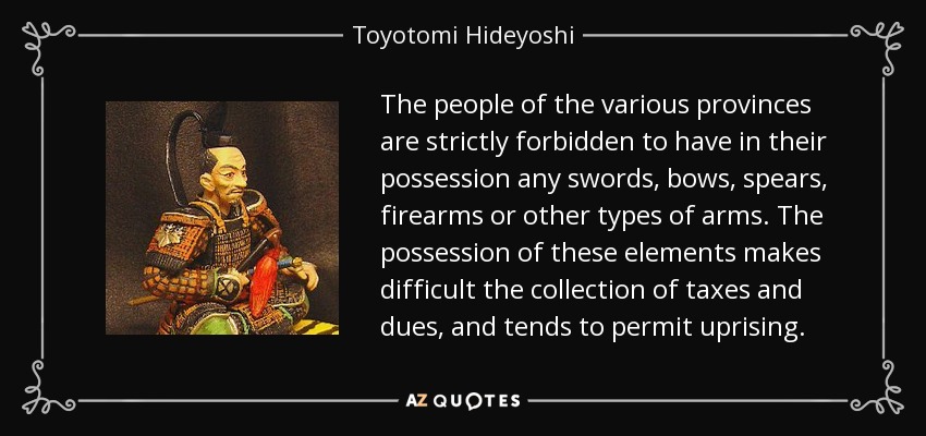 The people of the various provinces are strictly forbidden to have in their possession any swords, bows, spears, firearms or other types of arms. The possession of these elements makes difficult the collection of taxes and dues, and tends to permit uprising.
