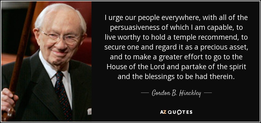 I urge our people everywhere, with all of the persuasiveness of which I am capable, to live worthy to hold a temple recommend, to secure one and regard it as a precious asset, and to make a greater effort to go to the House of the Lord and partake of the spirit and the blessings to be had therein.