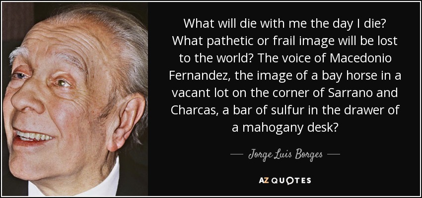 What will die with me the day I die? What pathetic or frail image will be lost to the world? The voice of Macedonio Fernandez, the image of a bay horse in a vacant lot on the corner of Sarrano and Charcas, a bar of sulfur in the drawer of a mahogany desk?