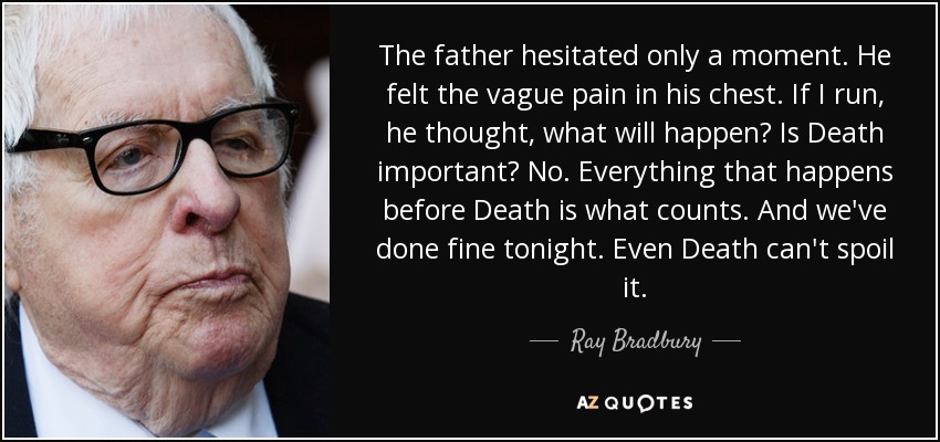 The father hesitated only a moment. He felt the vague pain in his chest. If I run, he thought, what will happen? Is Death important? No. Everything that happens before Death is what counts. And we've done fine tonight. Even Death can't spoil it.