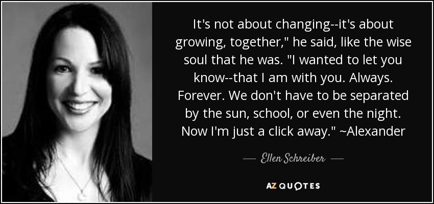 It's not about changing--it's about growing, together," he said, like the wise soul that he was. "I wanted to let you know--that I am with you. Always. Forever. We don't have to be separated by the sun, school, or even the night. Now I'm just a click away." ~Alexander