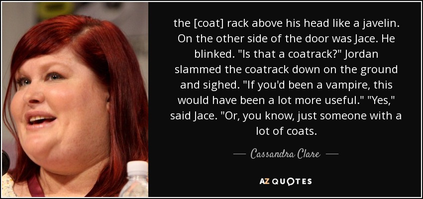 the [coat] rack above his head like a javelin. On the other side of the door was Jace. He blinked. "Is that a coatrack?" Jordan slammed the coatrack down on the ground and sighed. "If you'd been a vampire, this would have been a lot more useful." "Yes," said Jace. "Or, you know, just someone with a lot of coats.