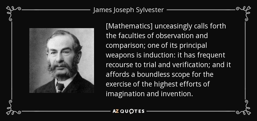 [Mathematics] unceasingly calls forth the faculties of observation and comparison; one of its principal weapons is induction: it has frequent recourse to trial and verification; and it affords a boundless scope for the exercise of the highest efforts of imagination and invention.