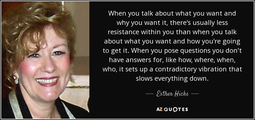 When you talk about what you want and why you want it, there's usually less resistance within you than when you talk about what you want and how you're going to get it. When you pose questions you don't have answers for, like how, where, when, who, it sets up a contradictory vibration that slows everything down.