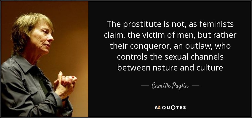 The prostitute is not, as feminists claim, the victim of men, but rather their conqueror, an outlaw, who controls the sexual channels between nature and culture