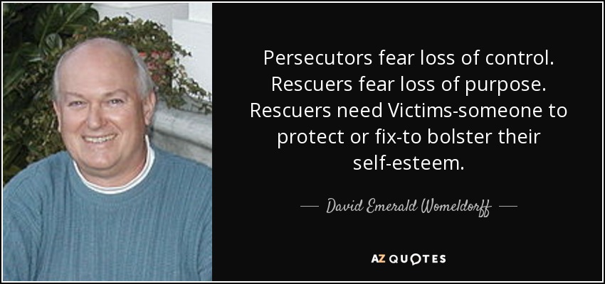 Persecutors fear loss of control. Rescuers fear loss of purpose. Rescuers need Victims-someone to protect or fix-to bolster their self-esteem.