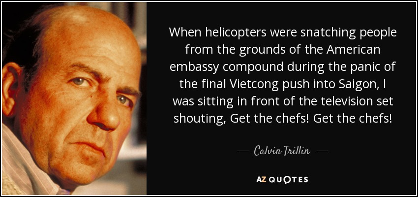 When helicopters were snatching people from the grounds of the American embassy compound during the panic of the final Vietcong push into Saigon, I was sitting in front of the television set shouting, Get the chefs! Get the chefs!