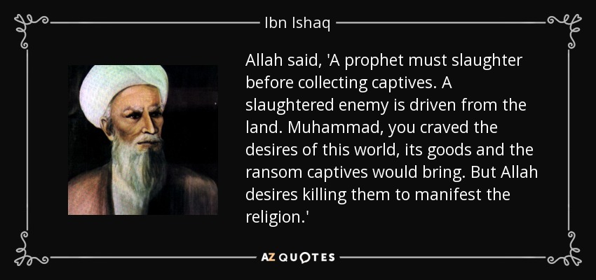 Allah said, 'A prophet must slaughter before collecting captives. A slaughtered enemy is driven from the land. Muhammad, you craved the desires of this world, its goods and the ransom captives would bring. But Allah desires killing them to manifest the religion.'