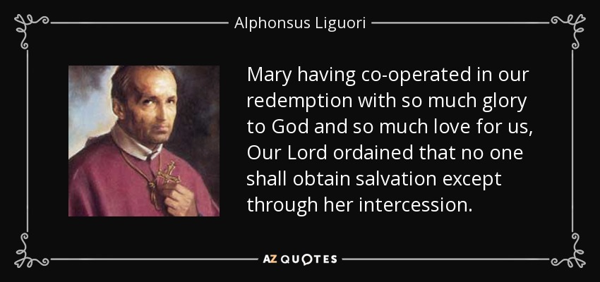 Mary having co-operated in our redemption with so much glory to God and so much love for us, Our Lord ordained that no one shall obtain salvation except through her intercession.