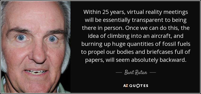 Within 25 years, virtual reality meetings will be essentially transparent to being there in person. Once we can do this, the idea of climbing into an aircraft, and burning up huge quantities of fossil fuels to propel our bodies and briefcases full of papers, will seem absolutely backward.