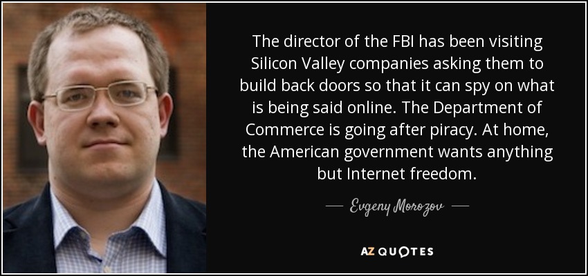 The director of the FBI has been visiting Silicon Valley companies asking them to build back doors so that it can spy on what is being said online. The Department of Commerce is going after piracy. At home, the American government wants anything but Internet freedom.