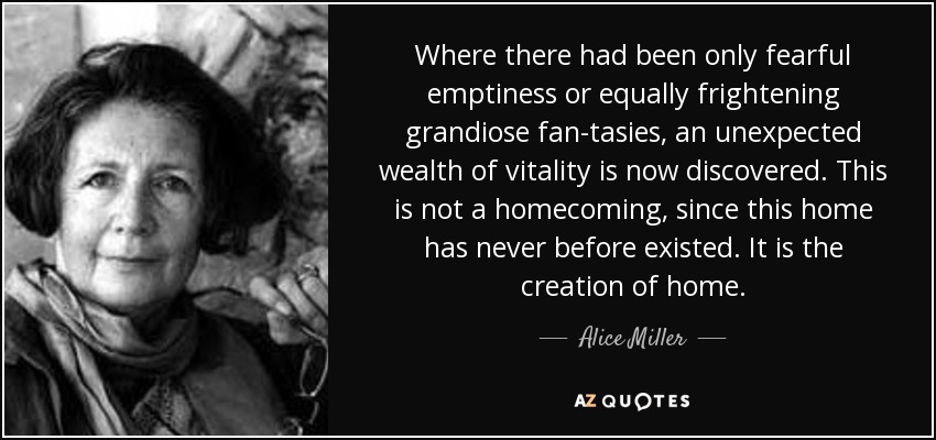 Where there had been only fearful emptiness or equally frightening grandiose fantasies, an unexpected wealth of vitality is now discovered. This is not a homecoming, since this home has never before existed. It is the creation of home.