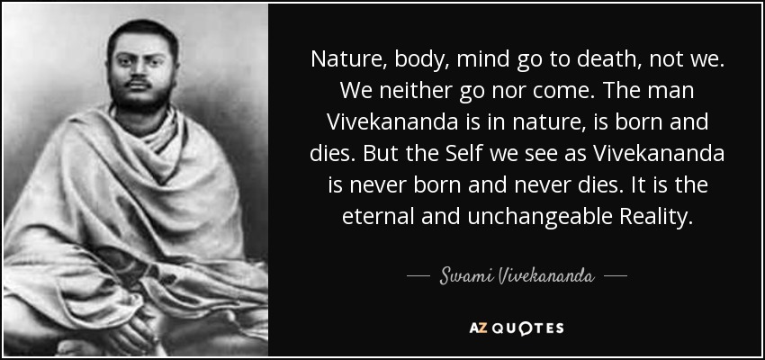 Nature, body, mind go to death, not we. We neither go nor come. The man Vivekananda is in nature, is born and dies. But the Self we see as Vivekananda is never born and never dies. It is the eternal and unchangeable Reality.
