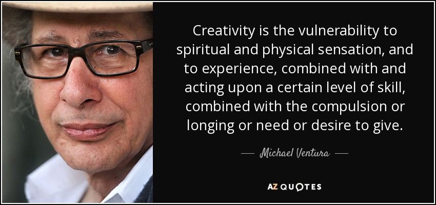 Creativity is the vulnerability to spiritual and physical sensation, and to experience, combined with and acting upon a certain level of skill, combined with the compulsion or longing or need or desire to give.