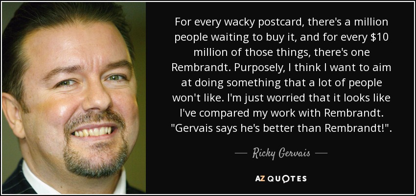 For every wacky postcard, there's a million people waiting to buy it, and for every $10 million of those things, there's one Rembrandt. Purposely, I think I want to aim at doing something that a lot of people won't like. I'm just worried that it looks like I've compared my work with Rembrandt. "Gervais says he's better than Rembrandt!".