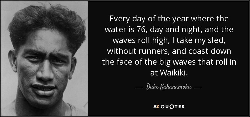 Every day of the year where the water is 76, day and night, and the waves roll high, I take my sled, without runners, and coast down the face of the big waves that roll in at Waikiki.