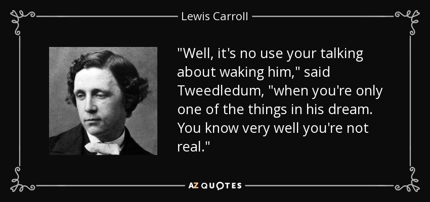 "Well, it's no use your talking about waking him," said Tweedledum, "when you're only one of the things in his dream. You know very well you're not real."
