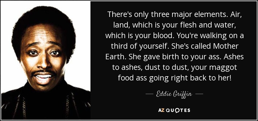 There's only three major elements. Air, land, which is your flesh and water, which is your blood. You're walking on a third of yourself. She's called Mother Earth. She gave birth to your ass. Ashes to ashes, dust to dust, your maggot food ass going right back to her!