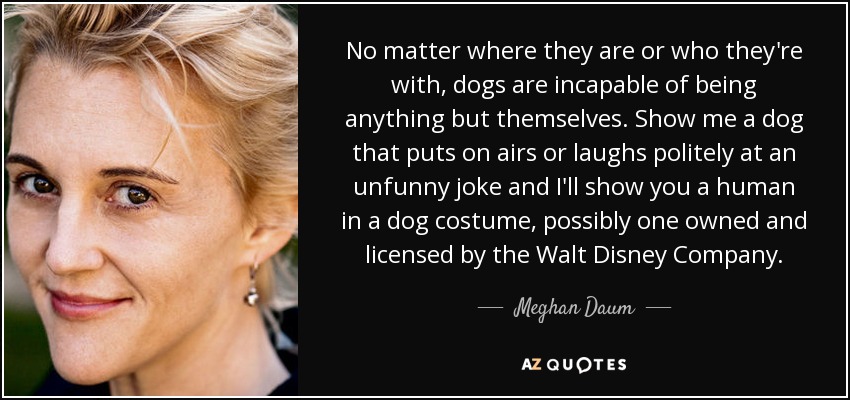 No matter where they are or who they're with, dogs are incapable of being anything but themselves. Show me a dog that puts on airs or laughs politely at an unfunny joke and I'll show you a human in a dog costume, possibly one owned and licensed by the Walt Disney Company.