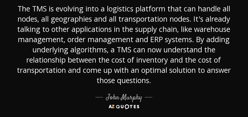 The TMS is evolving into a logistics platform that can handle all nodes, all geographies and all transportation nodes. It's already talking to other applications in the supply chain, like warehouse management, order management and ERP systems. By adding underlying algorithms, a TMS can now understand the relationship between the cost of inventory and the cost of transportation and come up with an optimal solution to answer those questions.