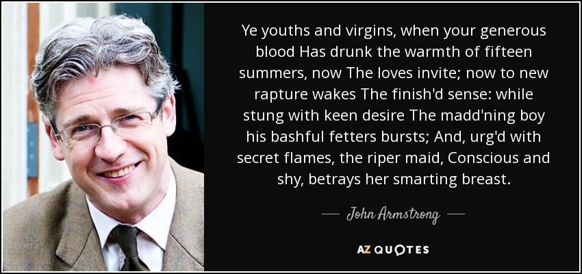 Ye youths and virgins, when your generous blood Has drunk the warmth of fifteen summers, now The loves invite; now to new rapture wakes The finish'd sense: while stung with keen desire The madd'ning boy his bashful fetters bursts; And, urg'd with secret flames, the riper maid, Conscious and shy, betrays her smarting breast.