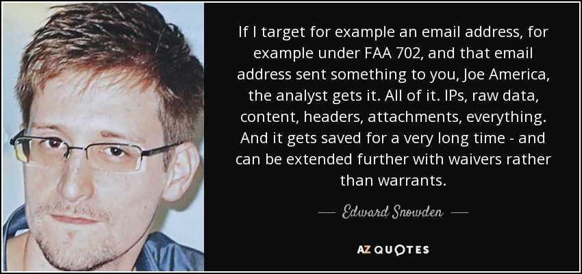 If I target for example an email address, for example under FAA 702, and that email address sent something to you, Joe America, the analyst gets it. All of it. IPs, raw data, content, headers, attachments, everything. And it gets saved for a very long time - and can be extended further with waivers rather than warrants.