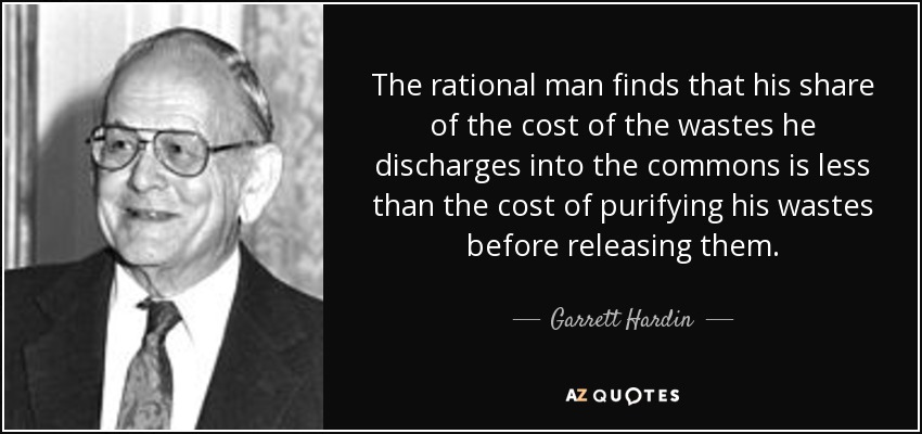 The rational man finds that his share of the cost of the wastes he discharges into the commons is less than the cost of purifying his wastes before releasing them.
