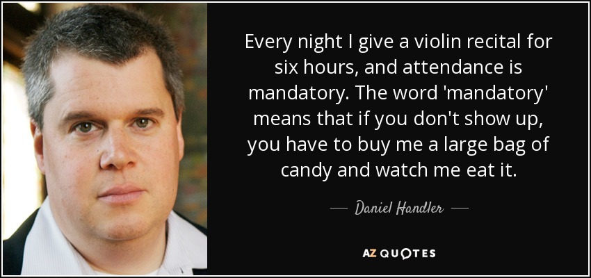 Every night I give a violin recital for six hours, and attendance is mandatory. The word 'mandatory' means that if you don't show up, you have to buy me a large bag of candy and watch me eat it.