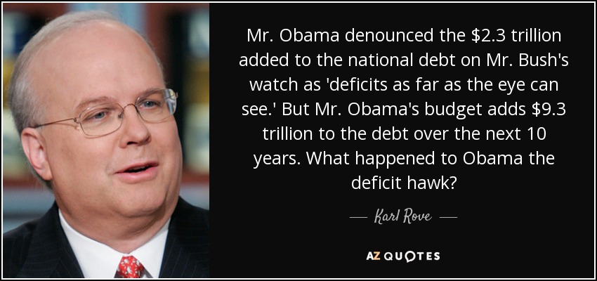 Mr. Obama denounced the $2.3 trillion added to the national debt on Mr. Bush's watch as 'deficits as far as the eye can see.' But Mr. Obama's budget adds $9.3 trillion to the debt over the next 10 years. What happened to Obama the deficit hawk?
