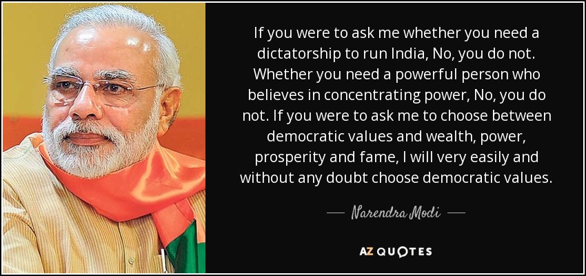 If you were to ask me whether you need a dictatorship to run India, No, you do not. Whether you need a powerful person who believes in concentrating power, No, you do not. If you were to ask me to choose between democratic values and wealth, power, prosperity and fame, I will very easily and without any doubt choose democratic values.