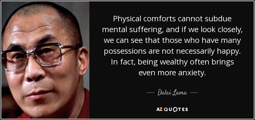 Physical comforts cannot subdue mental suffering, and if we look closely, we can see that those who have many possessions are not necessarily happy. In fact, being wealthy often brings even more anxiety.