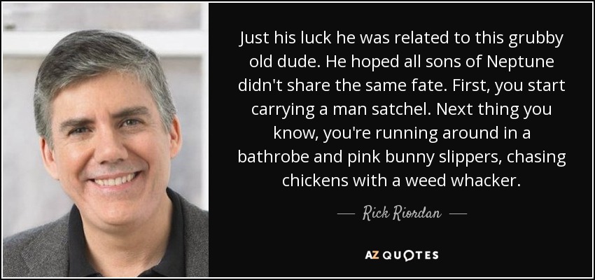 Just his luck he was related to this grubby old dude. He hoped all sons of Neptune didn't share the same fate. First, you start carrying a man satchel. Next thing you know, you're running around in a bathrobe and pink bunny slippers, chasing chickens with a weed whacker.