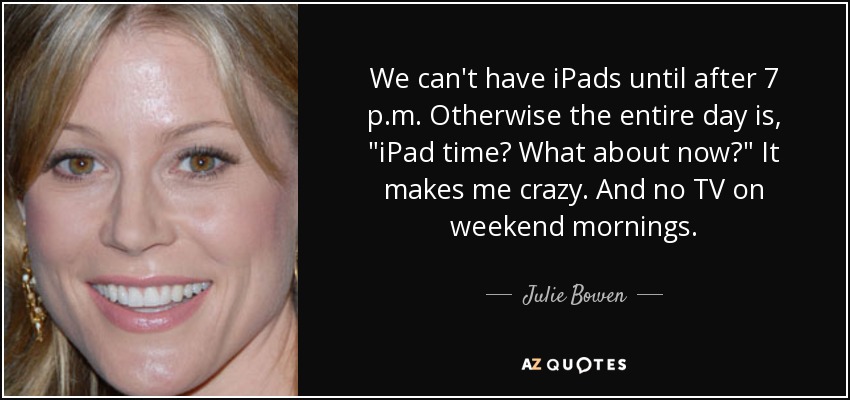 We can't have iPads until after 7 p.m. Otherwise the entire day is, "iPad time? What about now?" It makes me crazy. And no TV on weekend mornings.