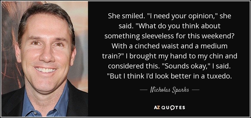 She smiled. "I need your opinion," she said. "What do you think about something sleeveless for this weekend? With a cinched waist and a medium train?" I brought my hand to my chin and considered this. "Sounds okay," I said. "But I think I'd look better in a tuxedo.