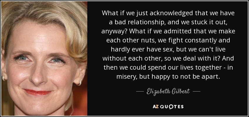 What if we just acknowledged that we have a bad relationship, and we stuck it out, anyway? What if we admitted that we make each other nuts, we fight constantly and hardly ever have sex, but we can't live without each other, so we deal with it? And then we could spend our lives together - in misery, but happy to not be apart.