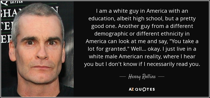 I am a white guy in America with an education, albeit high school, but a pretty good one. Another guy from a different demographic or different ethnicity in America can look at me and say, "You take a lot for granted." Well... okay. I just live in a white male American reality, where I hear you but I don't know if I necessarily read you.