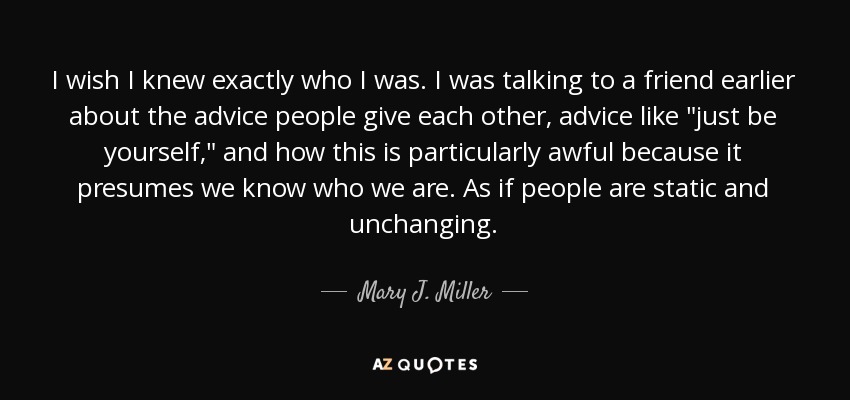 I wish I knew exactly who I was. I was talking to a friend earlier about the advice people give each other, advice like "just be yourself," and how this is particularly awful because it presumes we know who we are. As if people are static and unchanging.