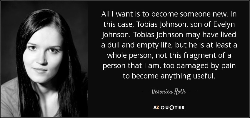 All I want is to become someone new. In this case, Tobias Johnson, son of Evelyn Johnson. Tobias Johnson may have lived a dull and empty life, but he is at least a whole person, not this fragment of a person that I am, too damaged by pain to become anything useful.