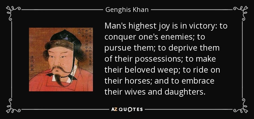 Man's highest joy is in victory: to conquer one's enemies; to pursue them; to deprive them of their possessions; to make their beloved weep; to ride on their horses; and to embrace their wives and daughters.