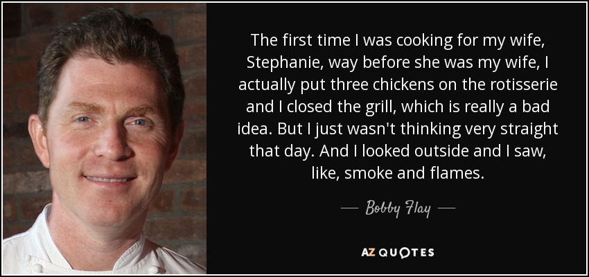 The first time I was cooking for my wife, Stephanie, way before she was my wife, I actually put three chickens on the rotisserie and I closed the grill, which is really a bad idea. But I just wasn't thinking very straight that day. And I looked outside and I saw, like, smoke and flames.