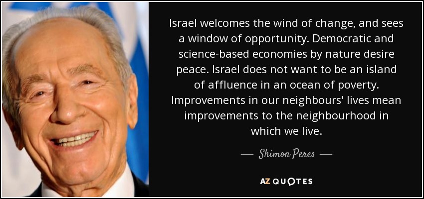 Israel welcomes the wind of change, and sees a window of opportunity. Democratic and science-based economies by nature desire peace. Israel does not want to be an island of affluence in an ocean of poverty. Improvements in our neighbours' lives mean improvements to the neighbourhood in which we live.