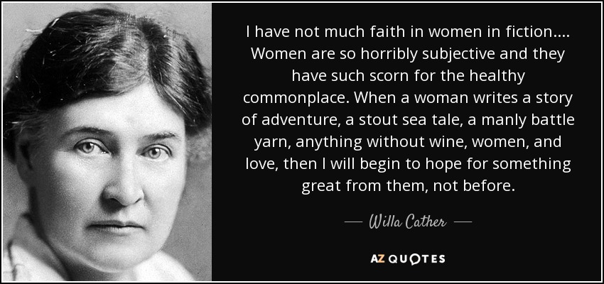 I have not much faith in women in fiction.... Women are so horribly subjective and they have such scorn for the healthy commonplace. When a woman writes a story of adventure, a stout sea tale, a manly battle yarn, anything without wine, women, and love, then I will begin to hope for something great from them, not before.