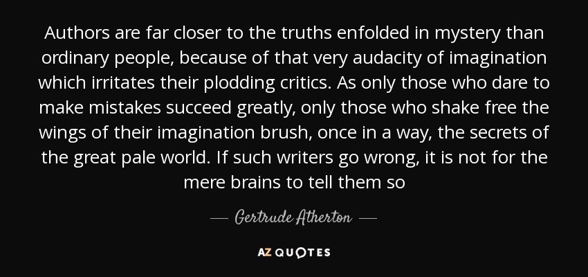Authors are far closer to the truths enfolded in mystery than ordinary people, because of that very audacity of imagination which irritates their plodding critics. As only those who dare to make mistakes succeed greatly, only those who shake free the wings of their imagination brush, once in a way, the secrets of the great pale world. If such writers go wrong, it is not for the mere brains to tell them so