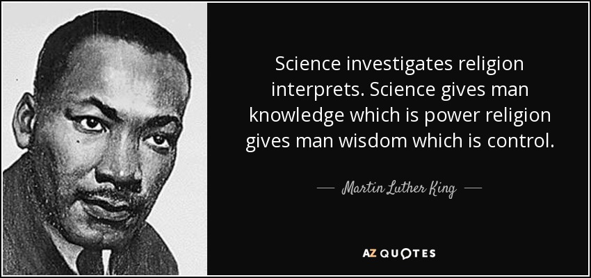 Science investigates religion interprets. Science gives man knowledge which is power religion gives man wisdom which is control.