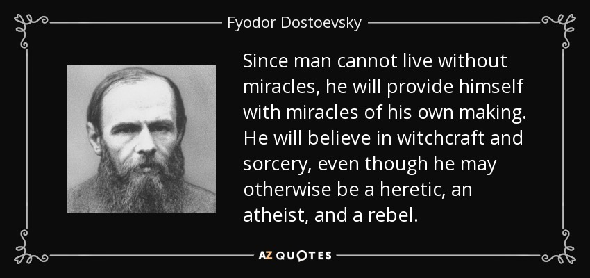 Since man cannot live without miracles, he will provide himself with miracles of his own making. He will believe in witchcraft and sorcery, even though he may otherwise be a heretic, an atheist, and a rebel.