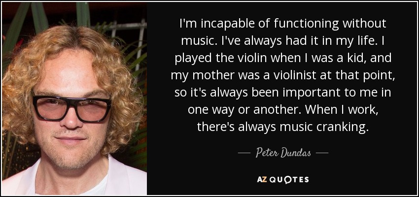 I'm incapable of functioning without music. I've always had it in my life. I played the violin when I was a kid, and my mother was a violinist at that point, so it's always been important to me in one way or another. When I work, there's always music cranking.