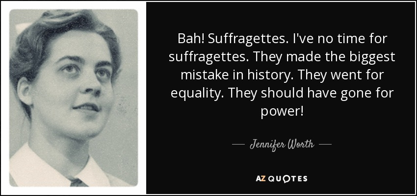 Bah! Suffragettes. I've no time for suffragettes. They made the biggest mistake in history. They went for equality. They should have gone for power!